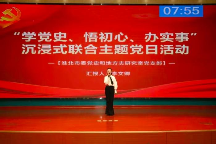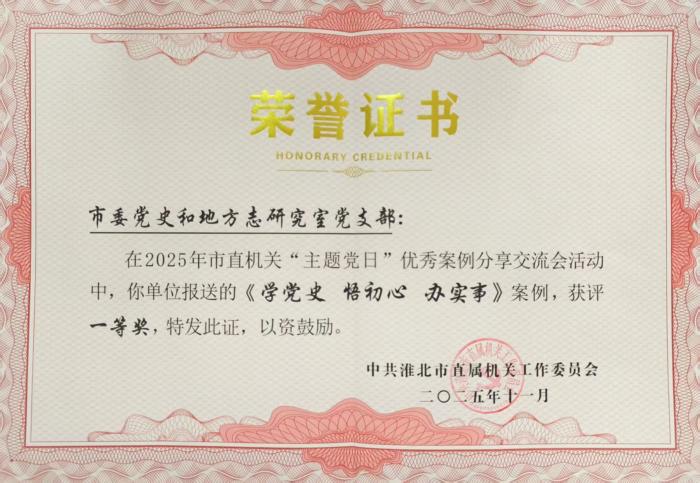 近日,在市直机关工委举办的“主题党日”优秀案例分享交流会上,由淮北市委党史和地方志研究室党支部报送的《“学党史、悟初心、办实事”沉浸式联合主题党日活动》案例,凭借鲜明的主题、创新的形式和扎实的成效,经过层层评选,荣获一等奖。